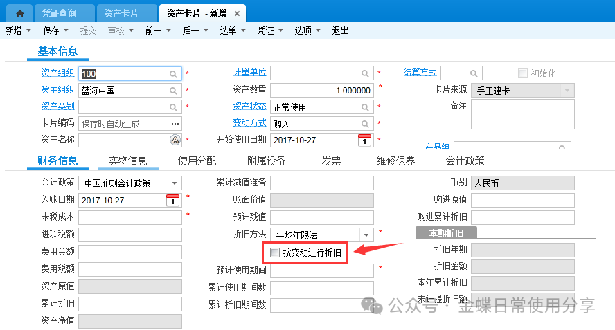 2. 若新增卡片时未勾选以上参数,后续做资产变更,变更了财务页签下信息时,会自动勾选该参数,然后按照该折旧方法下动态折旧公式进行折旧;