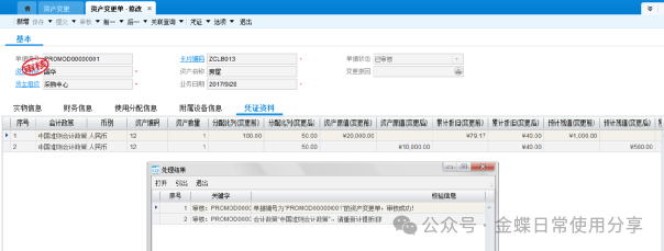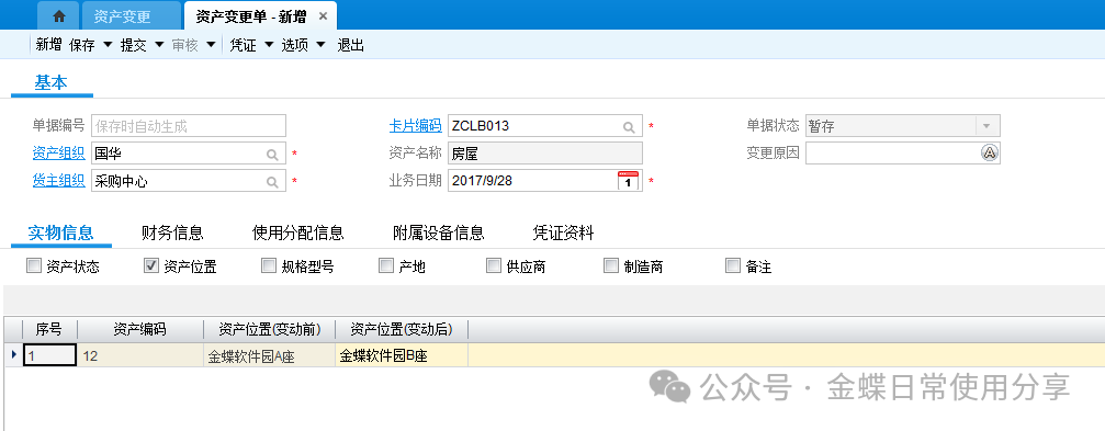 【功能菜单】:【资产管理】->【固定资产】->【日常管理】->【资产变更单】