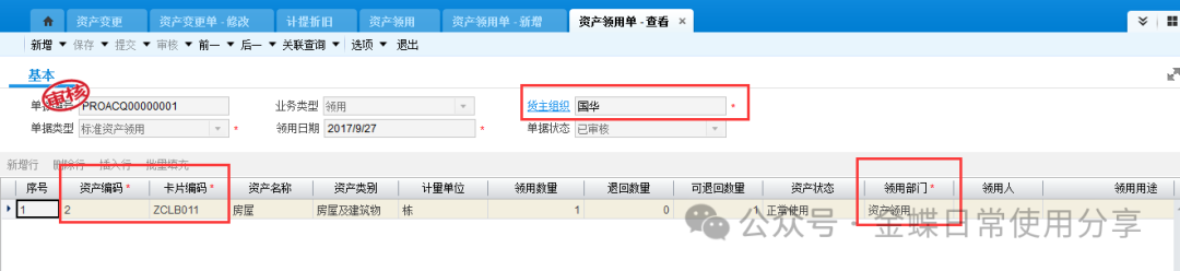 【操作说明】:这里的固定资产领用及借用指的是资产非财务性质的进行使用部门的变化,若涉及财务物权的转移则使用固定资产挪用。