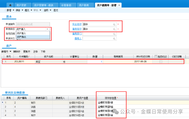 借用:根据此资产是借入还是借出来选择单据类型,选择货主组织及借用组织,选择卡片编码及数量,实物信息位置有改变的进行更改,没有改变的不维护。 因为系统支持一卡多物,实物信息会带出这张卡片上的所有实物,所以如果只借用一张卡片中的一个,请维护你借用的那一个。维护完数据提交审核。