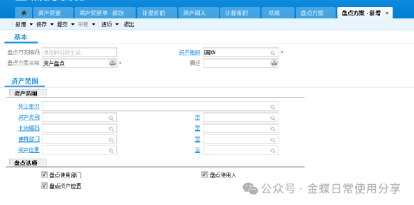 【功能菜单】:【资产管理】->【固定资产】->【资产盘点】->【盘点方案】